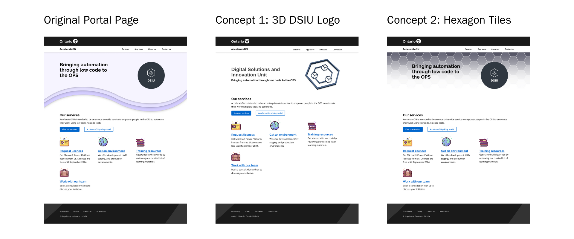 All designs adhere to the Ontario Design System to ensure consistency, accessibility, and alignment with government standards.