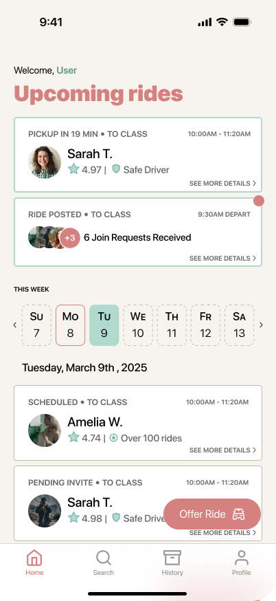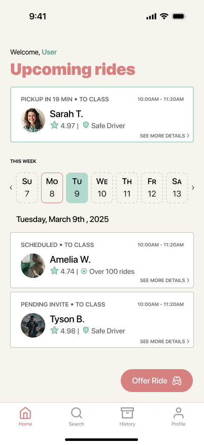 The platform also drives community engagement by connecting students from nearby schools for both academic and everyday trips, including groceries, local outings, and events. This expands mobility beyond campus while strengthening social connection and participation.