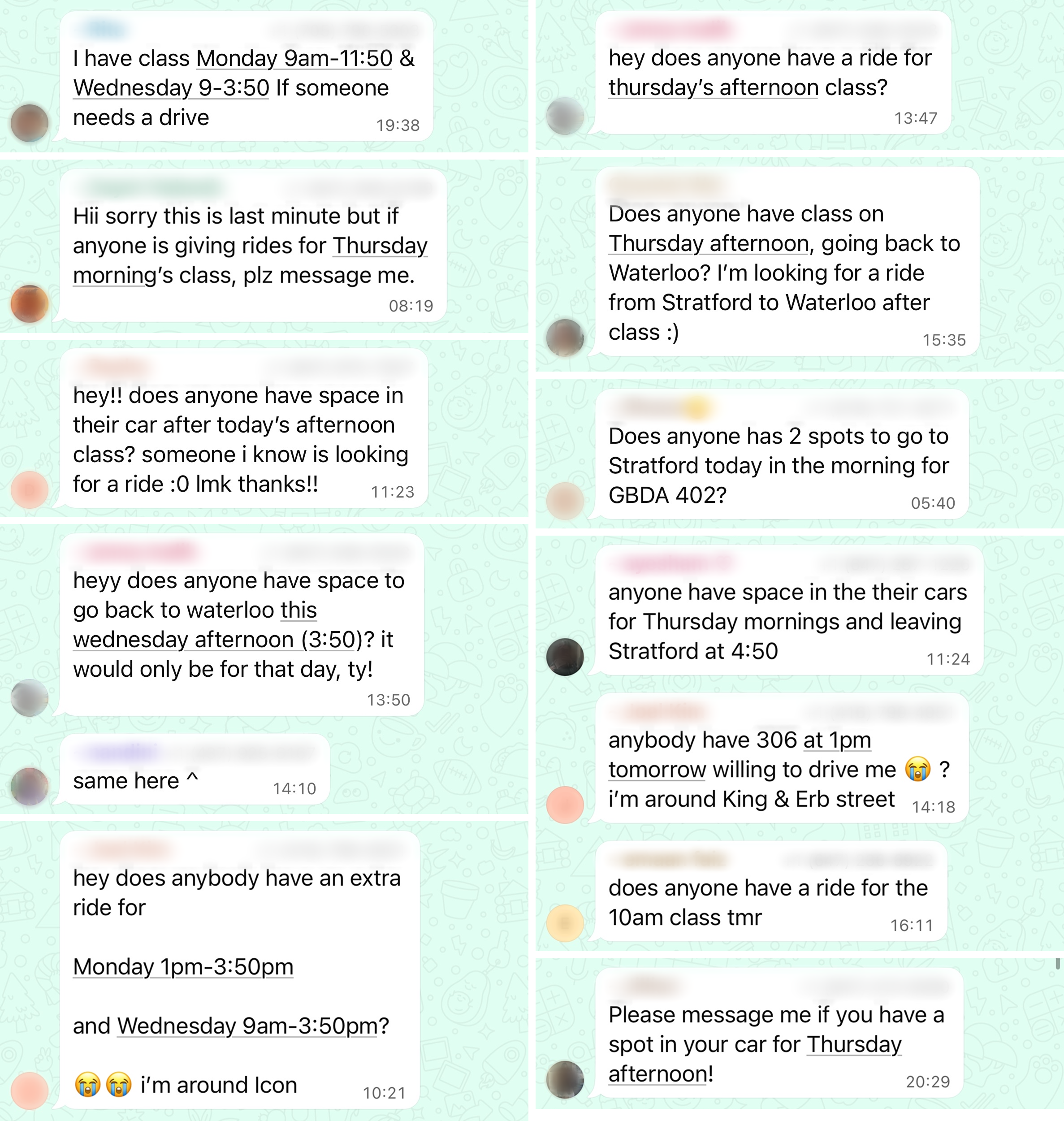 This issue emerged during my enrollment in the GBDA program at the University of Waterloo’s Stratford campus, a satellite campus located an hour from the main campus. With no public transportation between the two locations, nearly 600 GBDA students rely on carpooling to commute.